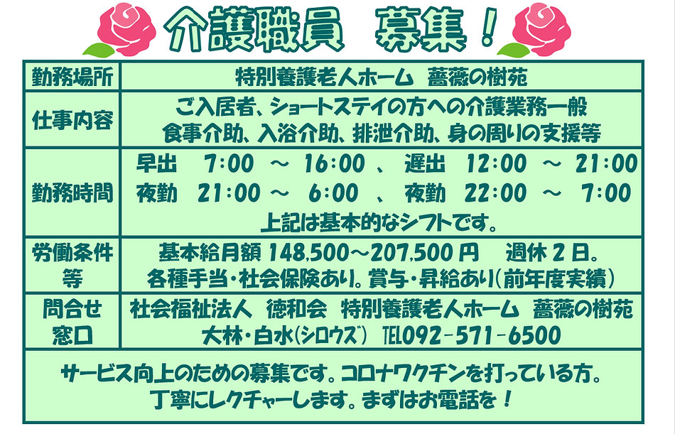 薔薇の樹苑、職員募集のページです。不明な点等ありましたら、
